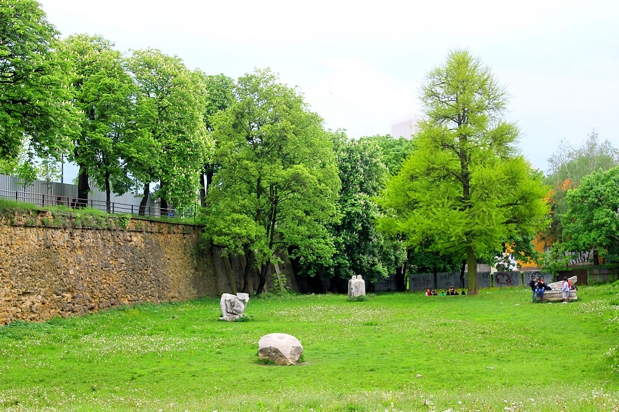Bastion wielokątny za kościołem franciszkanów, rozciągający się w kierunku ziemi.